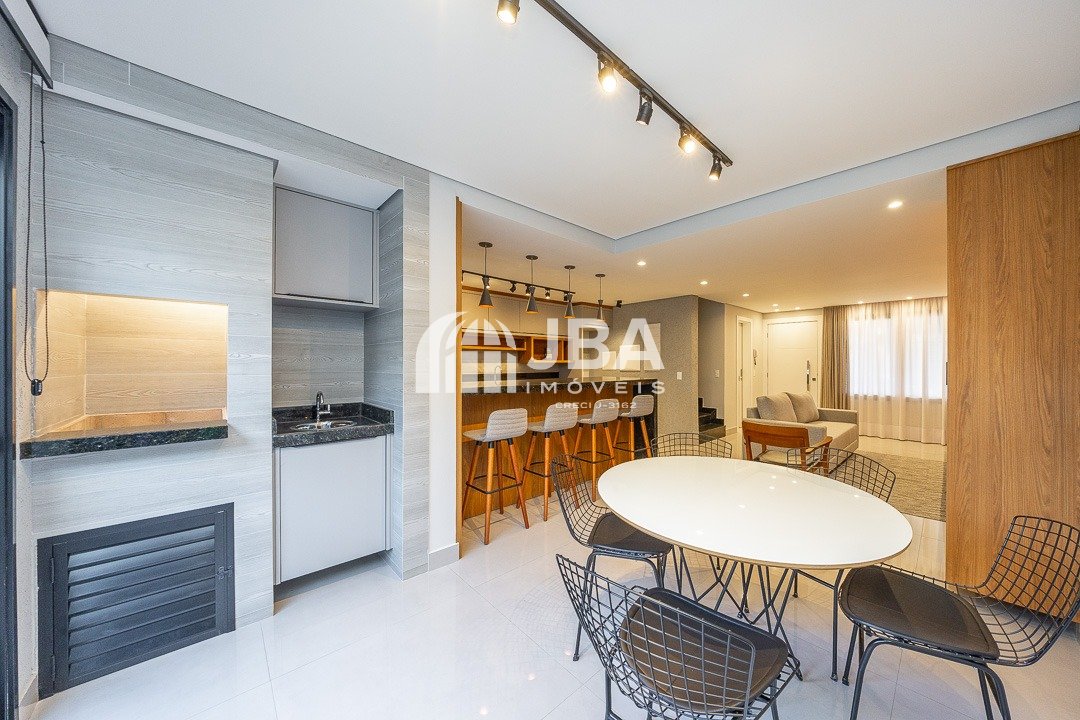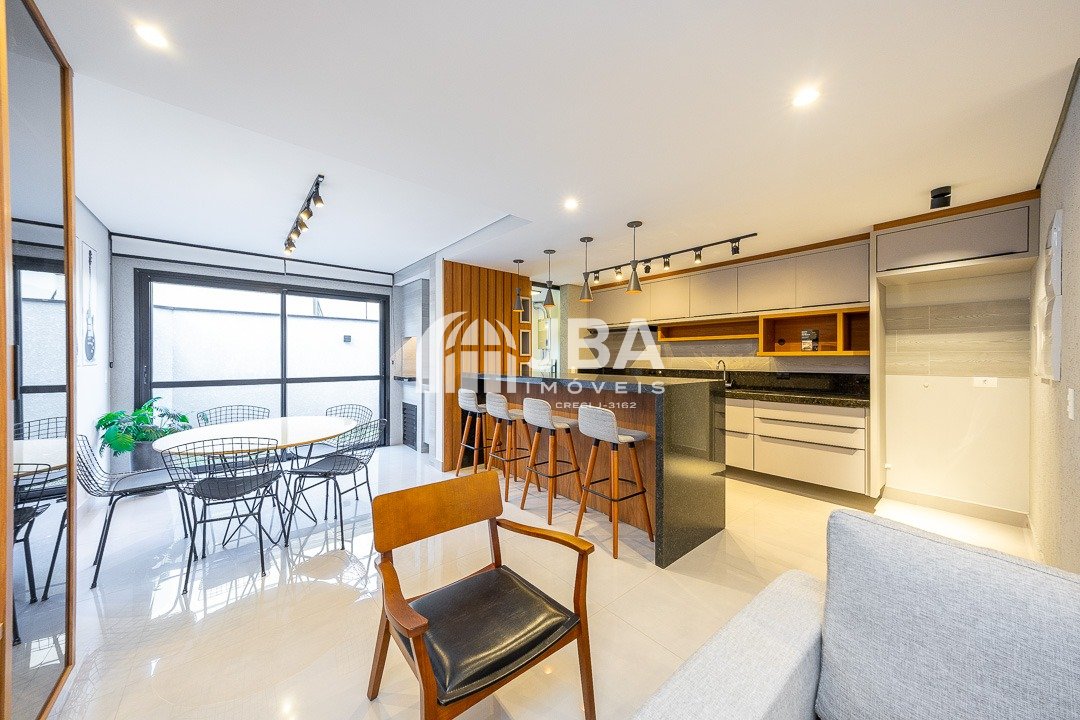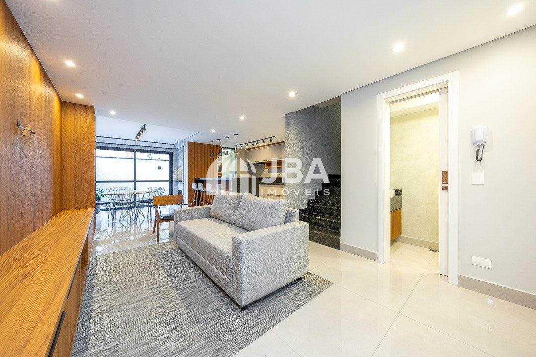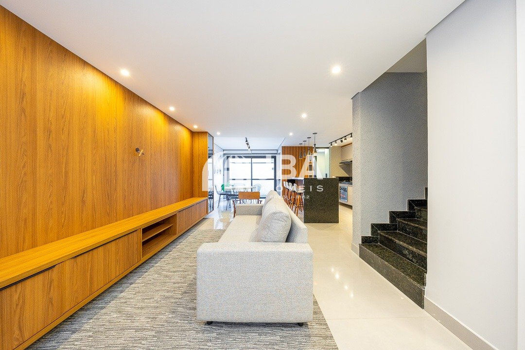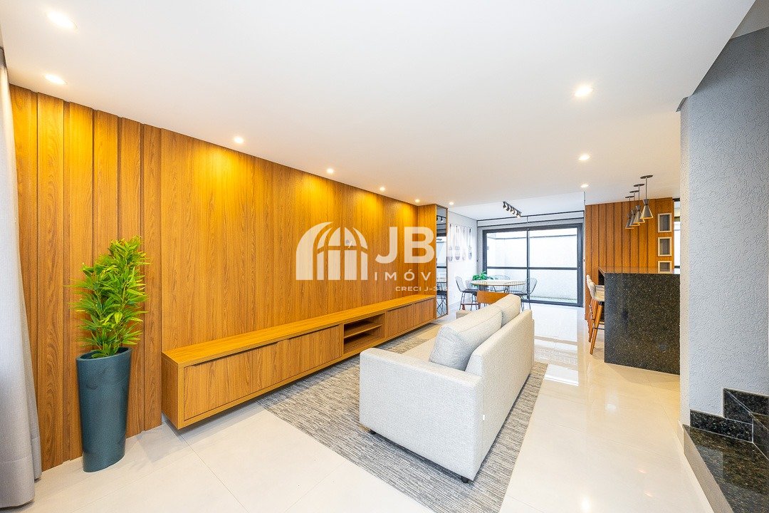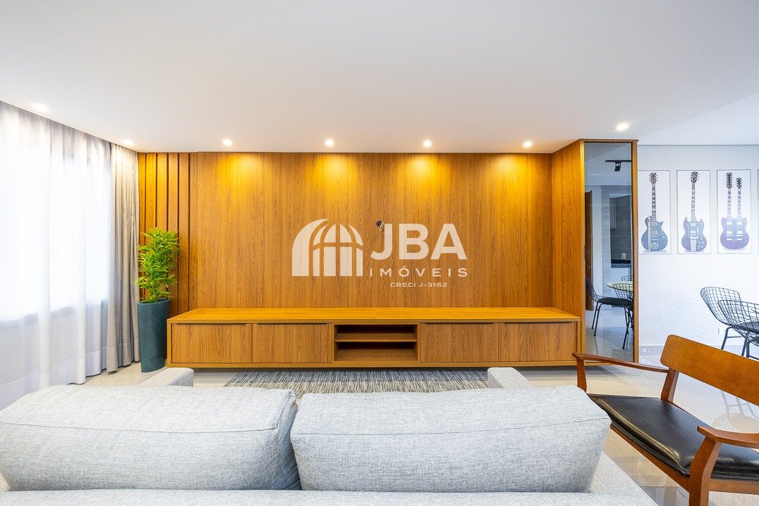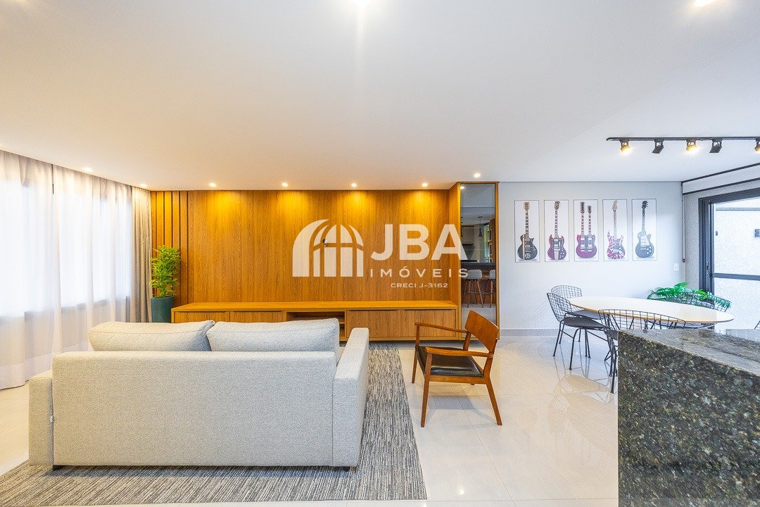 - Ampla sala para 2 ambientes, com acabamento com acabamento em porcelanato de alto padrão, painel de TV, sofá e cortinas, mesa com cadeiras, iluminação em Led;