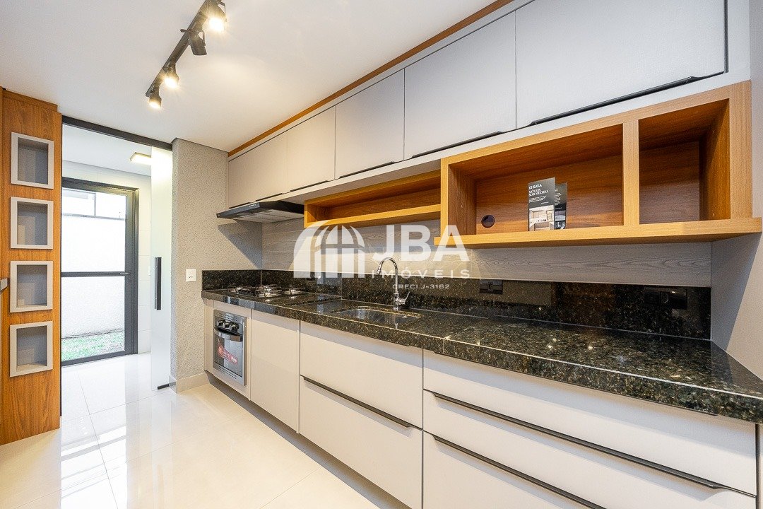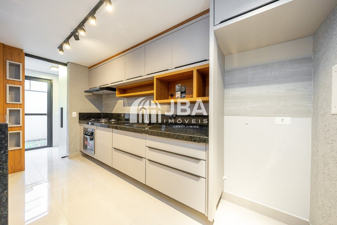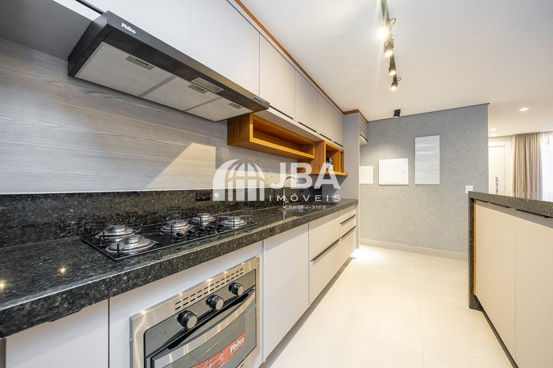 - Cozinha integrada com armários planejados, fogão e forno, moderna e funcional;