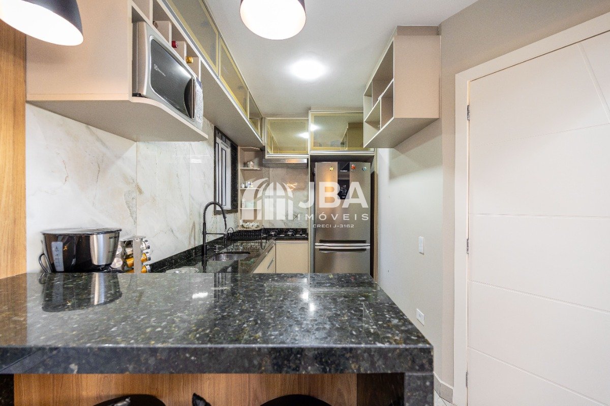 - Cozinha com móveis planejados, forno micro-ondas, fogão cooktop, coifa e geladeira;