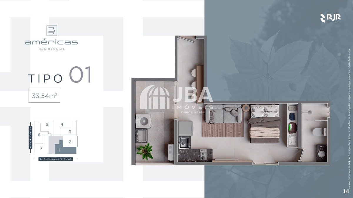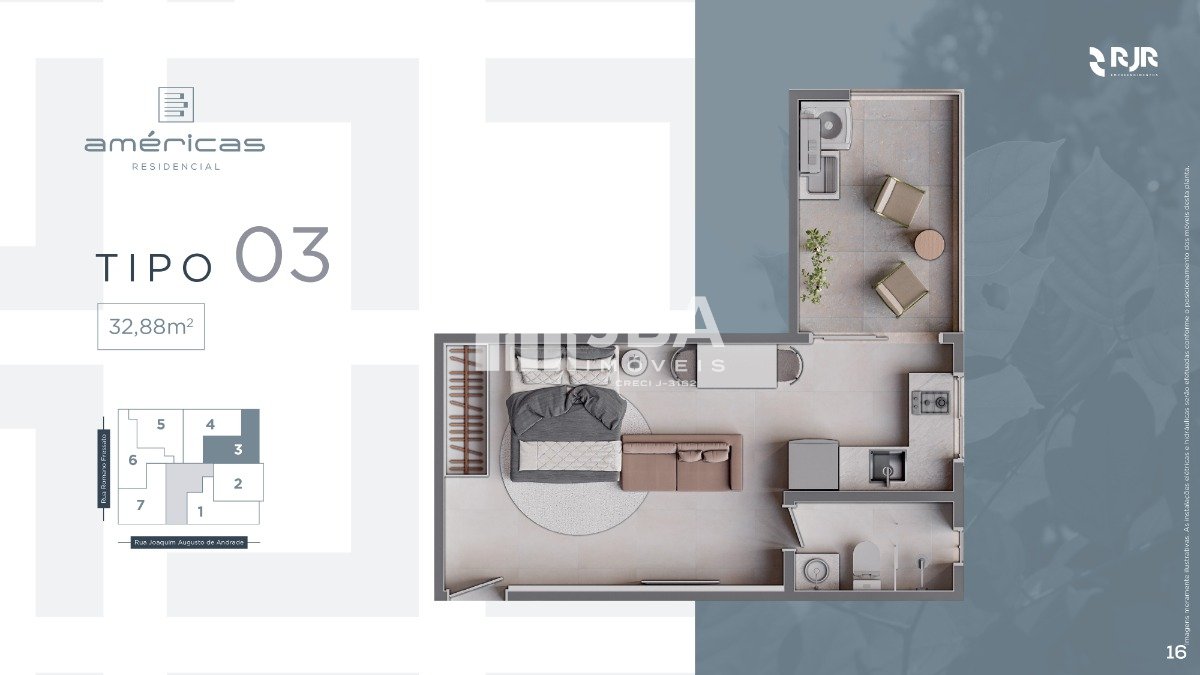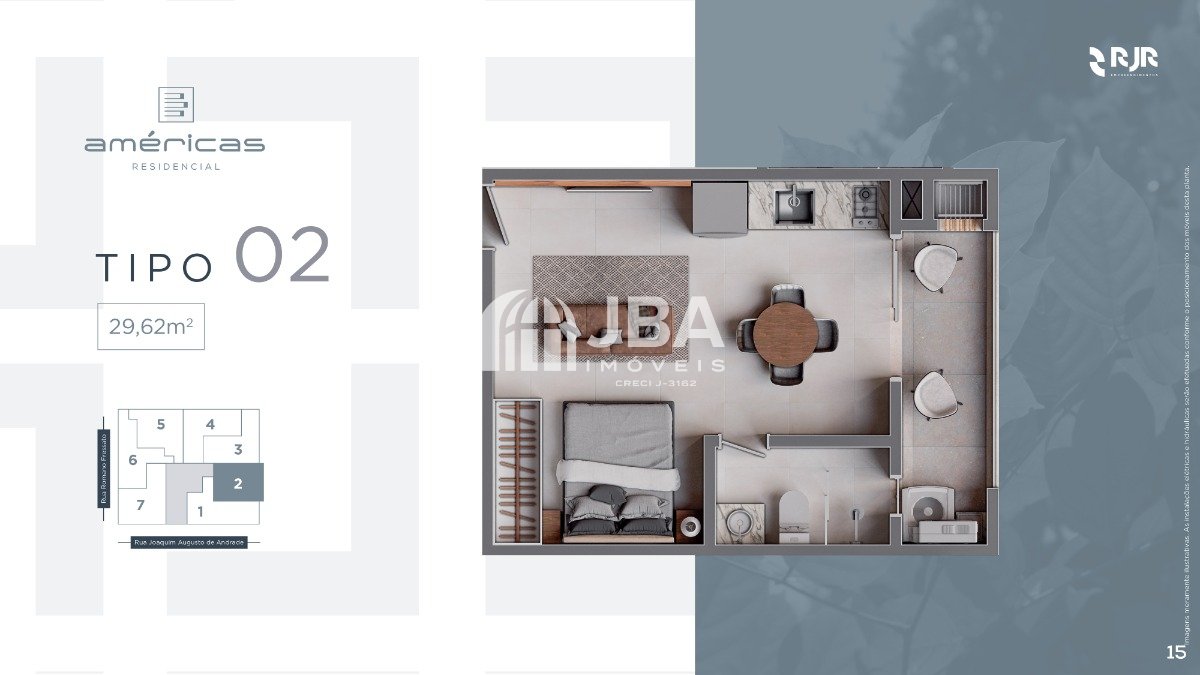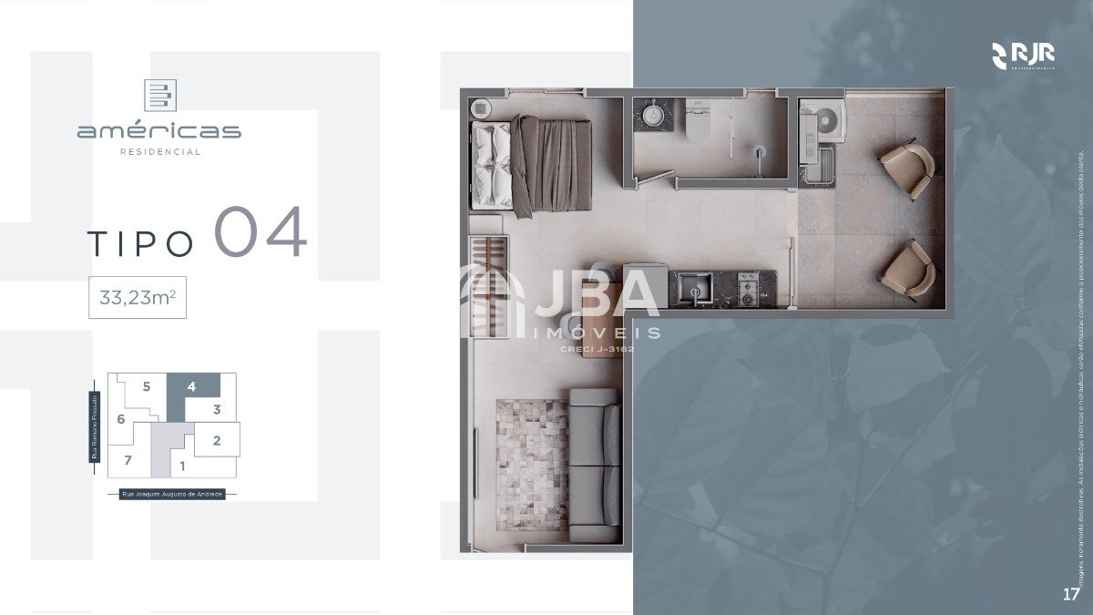 O condomínio conta com apartamentos studios com 7 opções de plantas, metragens que variam de 23,76m² a 33,79m² de área privativa, com sacada ou garden privativo, e opções com ou sem vaga de garagem.