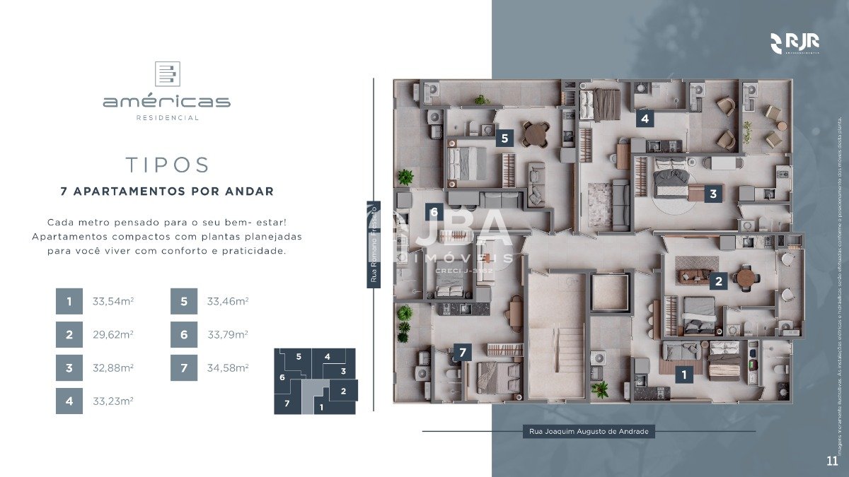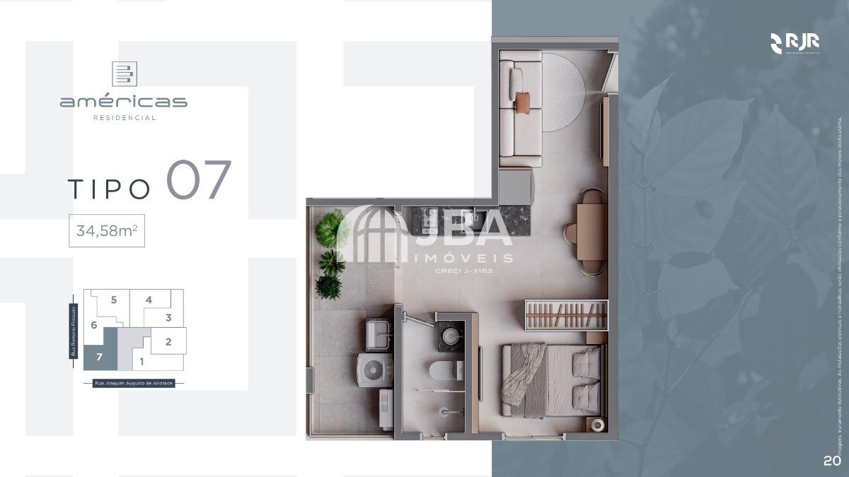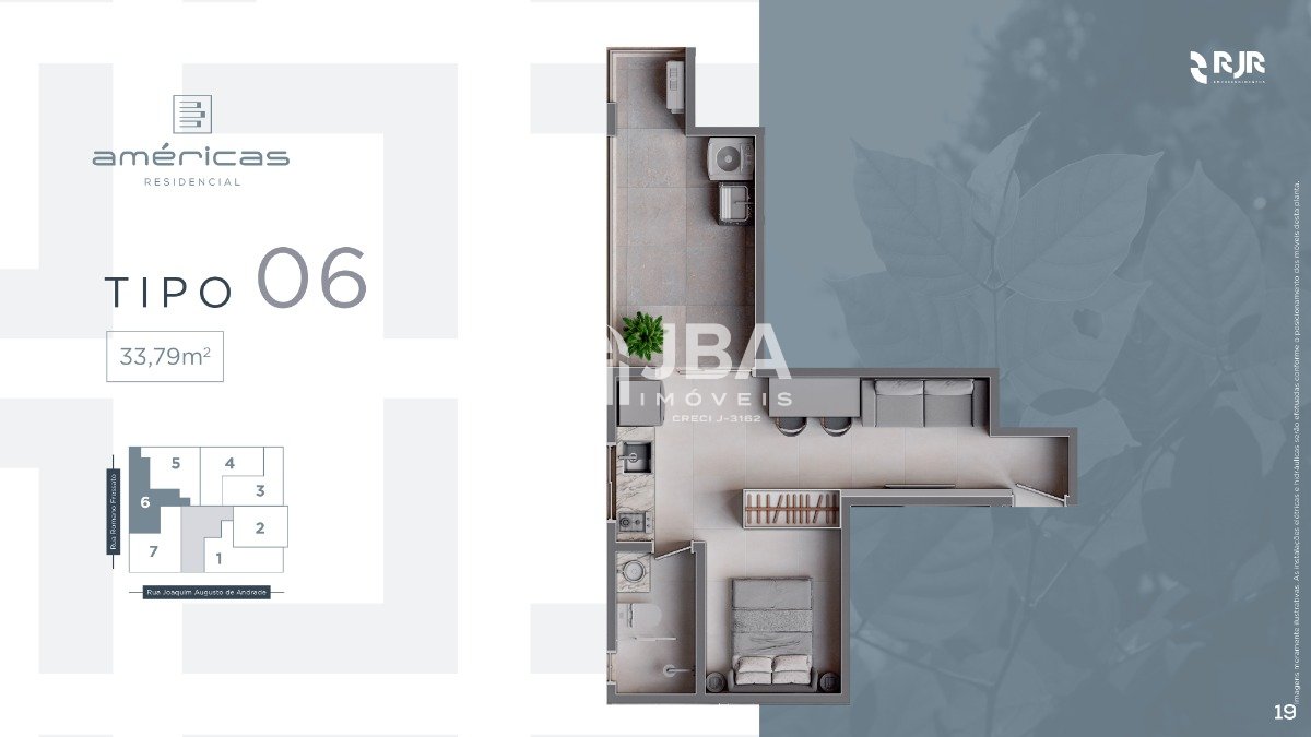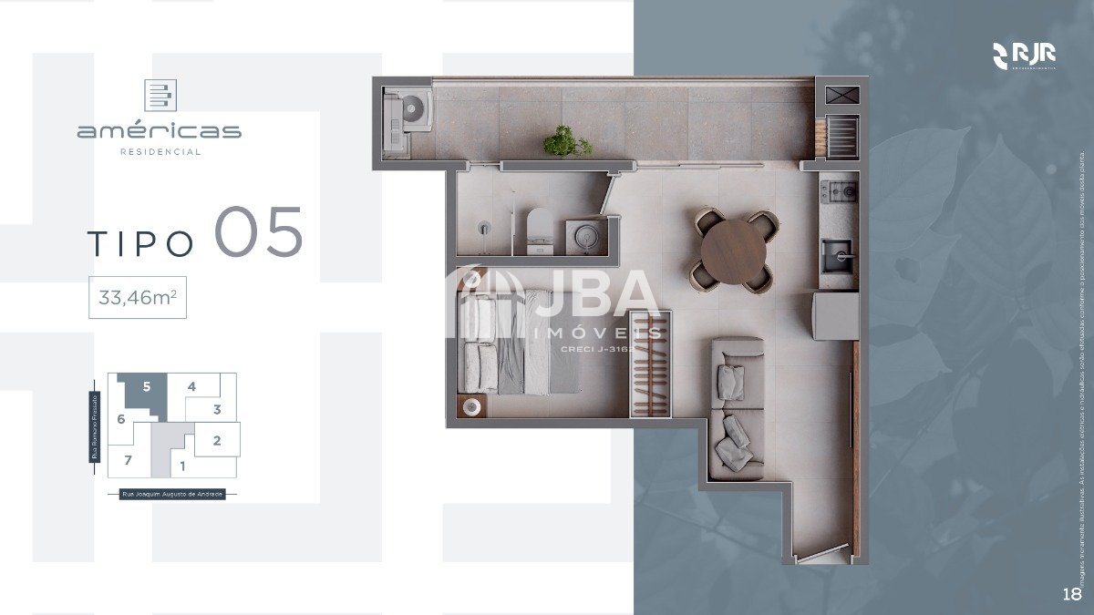O condomínio conta com apartamentos studios com 7 opções de plantas, metragens que variam de 23,76m² a 33,79m² de área privativa, com sacada ou garden privativo, e opções com ou sem vaga de garagem.