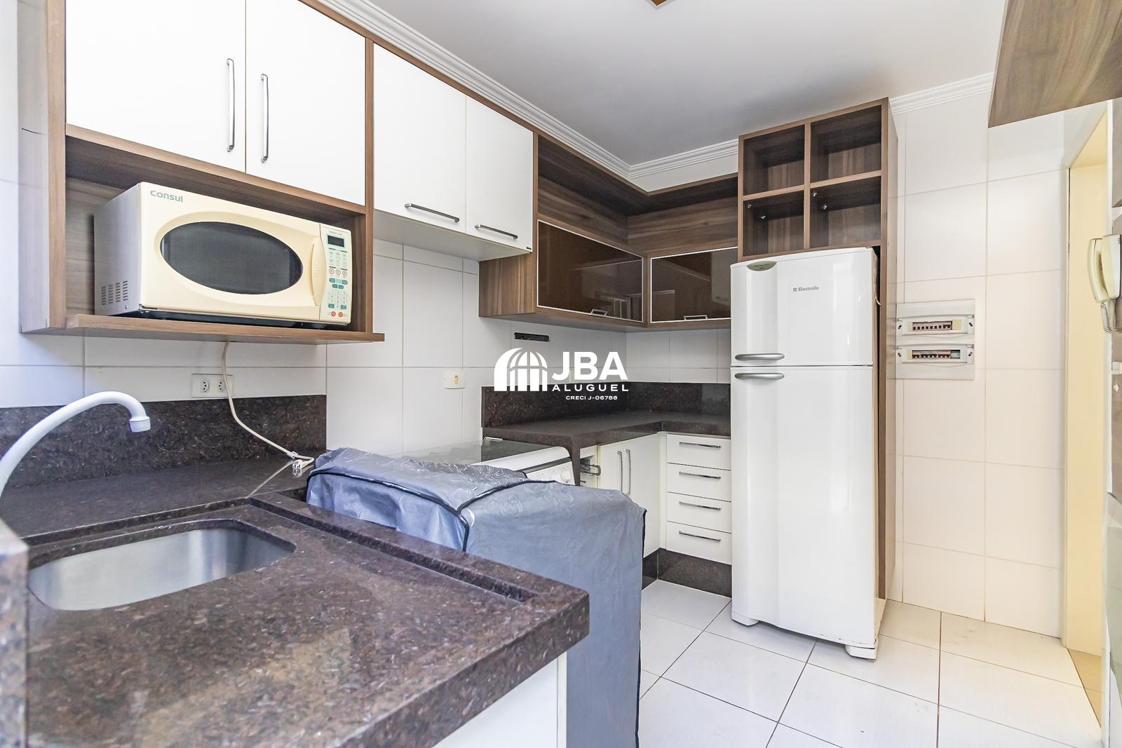 - Cozinha planejada, com armários, pia sob medida, fogão, geladeira e micro-ondas