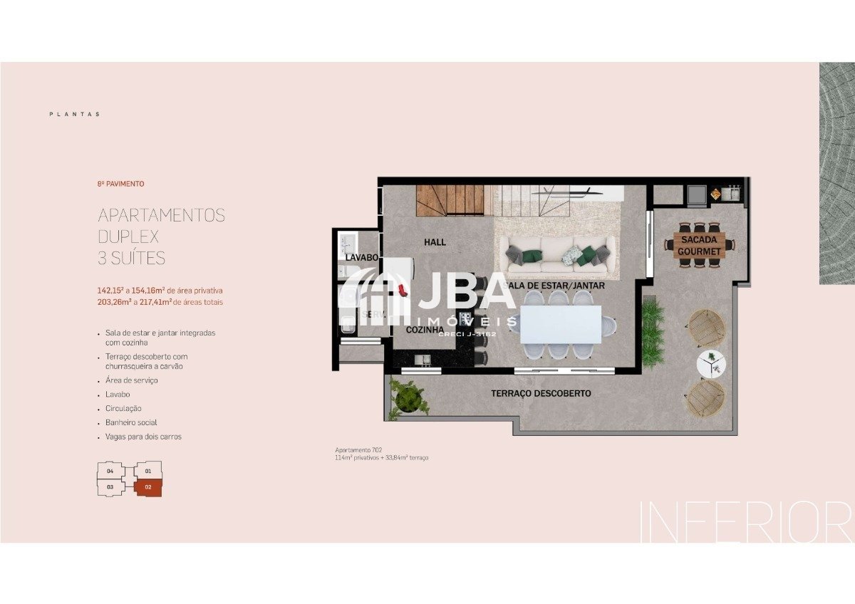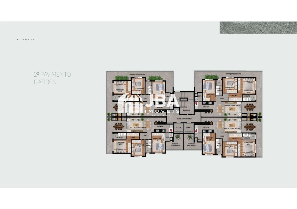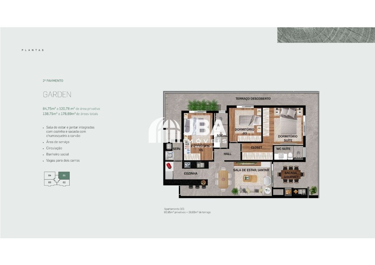 São 28 apartamentos, distribuídos em 4 gardens, 4 coberturas e 14 apartamentos tipo, com metragens que variam de 136,42 m² a 178,55 m² de área total, adaptáveis ao seu estilo de vida